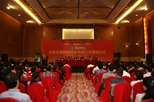 9月28日上午8時(shí)58分,安徽安糧控股股份有限公司(以下簡(jiǎn)稱安糧控股)揭牌儀式在合肥元一希爾頓酒店隆重舉行。安徽國(guó)貿(mào)集團(tuán)董事長(zhǎng)、黨委書(shū)記范陽(yáng)以及副董事長(zhǎng)李明菊、總經(jīng)理包祥華應(yīng)邀到會(huì)。香港遠(yuǎn)航集團(tuán)董事長(zhǎng)桂四海先生作為特別嘉賓出席儀式。安糧省糧油食品進(jìn)出口(集團(tuán))公司(以下簡(jiǎn)稱安糧集團(tuán))、安糧控股董事長(zhǎng)及公司其他領(lǐng)導(dǎo)金東、楊世芳、葛志毅、陶余清和國(guó)貿(mào)集團(tuán)核心企業(yè)來(lái)賓——技術(shù)公司總經(jīng)理程峰、輕工公司總裁柳夕良、服裝公司總經(jīng)理劉昕等,在主席臺(tái)就座。安糧集團(tuán)、安糧控股本部和五大子公司員工300余人參加了揭牌儀式。