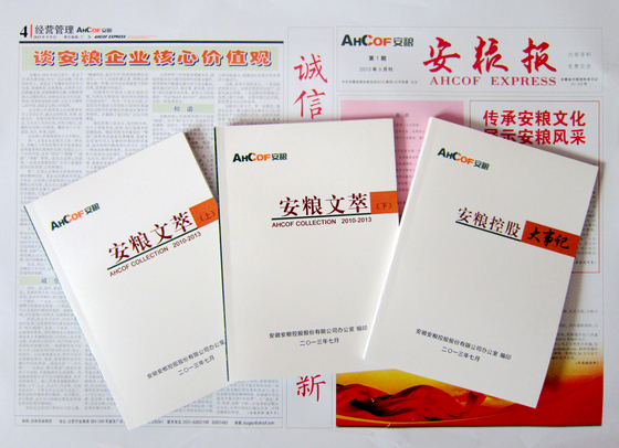 經(jīng)省新聞出版局批準(zhǔn),9月中旬,公司內(nèi)刊安糧報(bào)在試刊三期后正式創(chuàng)刊出版。國貿(mào)集團(tuán)范陽董事長專門發(fā)來賀信,對安糧報(bào)創(chuàng)刊表示祝賀。同時(shí),由辦公室編印的包括上級領(lǐng)導(dǎo)、安糧高管層和基層員工在公司網(wǎng)站發(fā)布的文章匯編——《安糧文萃》(上下冊)、內(nèi)容包括各子公司三年來重大事項(xiàng)的資料記錄——《安糧控股大事記》,也印發(fā)至各單位。