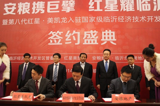 1月8日,安糧地產(chǎn)與中國家居行業(yè)核心競爭力第一品牌紅星·美凱龍家居集團(tuán)股份公司在國家級臨沂經(jīng)濟(jì)技術(shù)開發(fā)區(qū)管委會(huì)第六會(huì)議室舉行盛大簽約儀式。臨沂市人大常委會(huì)副主任、國家級臨沂經(jīng)濟(jì)技術(shù)開發(fā)區(qū)黨工委書記徐福田、安徽安糧控股股份有限公司常務(wù)副總裁方宗友、紅星美凱龍集團(tuán)黨委書記、執(zhí)行總裁蔣小忠等領(lǐng)導(dǎo)共同見證簽約盛典,國家級臨沂經(jīng)濟(jì)技術(shù)開發(fā)區(qū)管委會(huì)黨工委副書記陳永生、紅星美凱龍集團(tuán)發(fā)展中心總經(jīng)理劉海斌、安糧地產(chǎn)總經(jīng)理汪勇簽署合作協(xié)議。