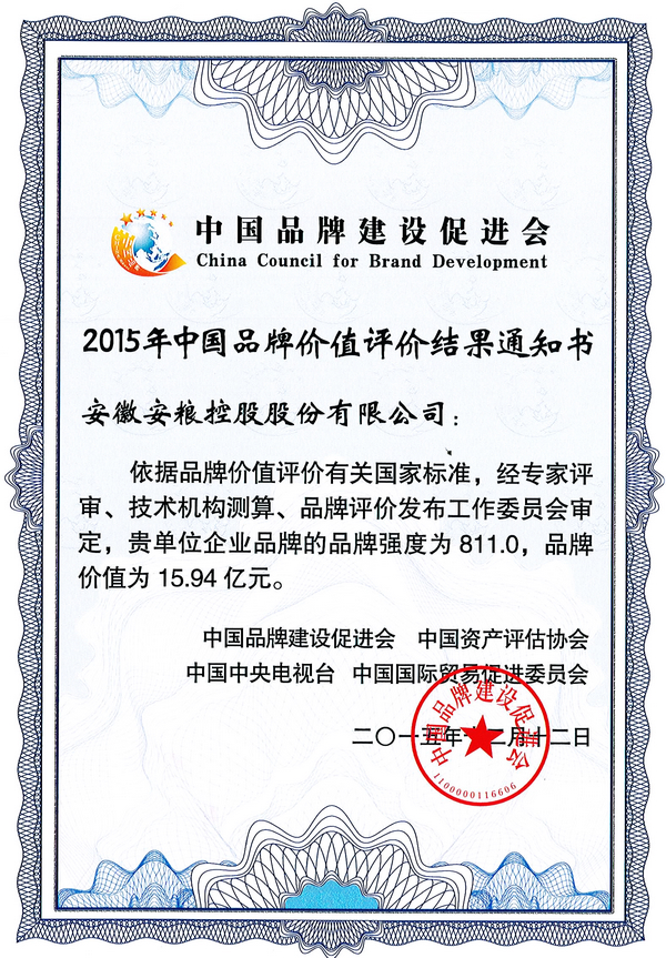 12月12日,由中國品牌建設(shè)促進(jìn)會、中央電視臺、中國資產(chǎn)評估協(xié)會、中國國際貿(mào)促會等聯(lián)合舉辦的“2015年中國品牌價值評價信息發(fā)布暨2015中國品牌發(fā)展論壇”在北京舉行。經(jīng)公司統(tǒng)一組織申報,“安糧”作為企業(yè)品牌榮登榜單,品牌價值15.94億元。