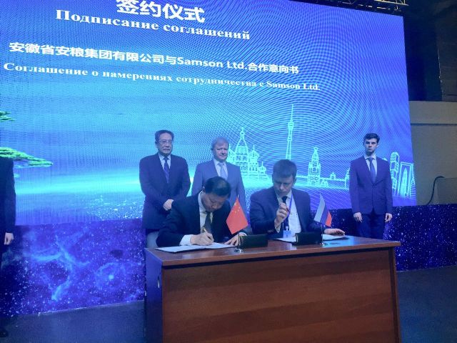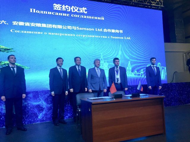 簽約儀式上,曹訓立董事長代表安糧集團與俄羅斯知名連鎖超市Samson Ltd.代表 Ilya Chekanov 先生簽署了雙方在深化合作擴大貿(mào)易額、電商業(yè)務的拓展以及Samson公司為安糧集團橋接當?shù)刭Y源向中國進口的戰(zhàn)略合作意向書。