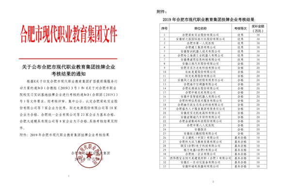 11月26日,合肥市現(xiàn)代職業(yè)教育集團掛牌企業(yè)考核結果揭曉,合肥建工在56家掛牌企業(yè)考核中取得第四名的好成績,考核等級被評為優(yōu)秀的七家企業(yè)之一。這是合肥建工開展校企合作以來,首次考核等級被評為優(yōu)秀,并獲得合肥市政府專項資金獎補。
