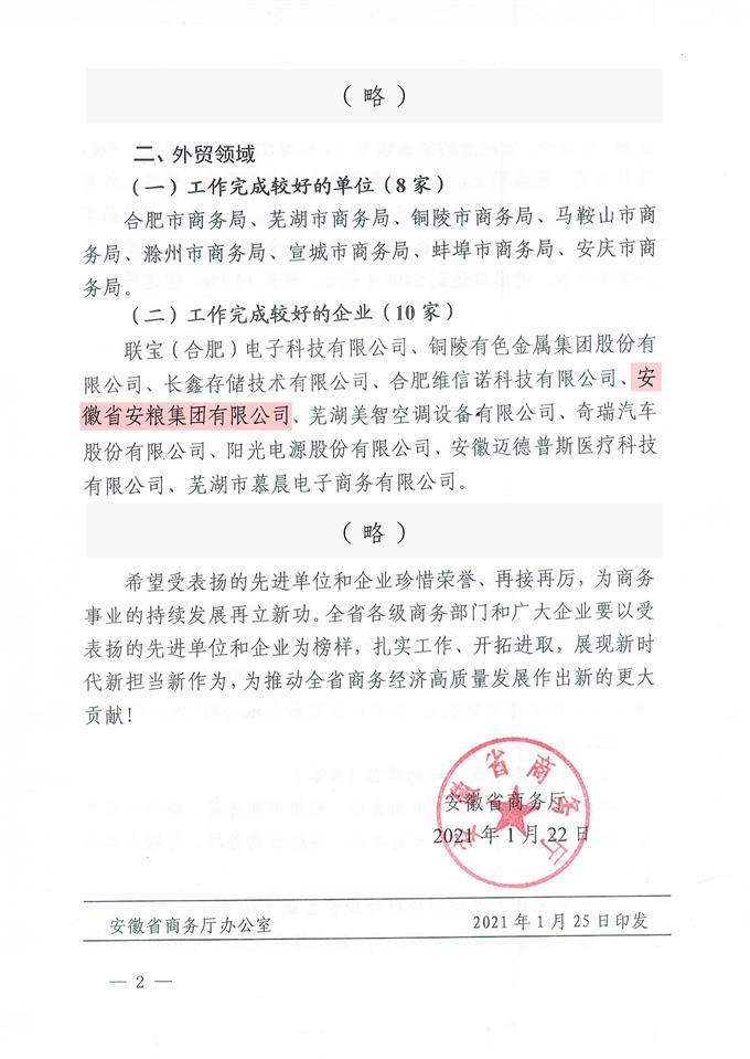 安糧集團(tuán)獲省商務(wù)廳表彰