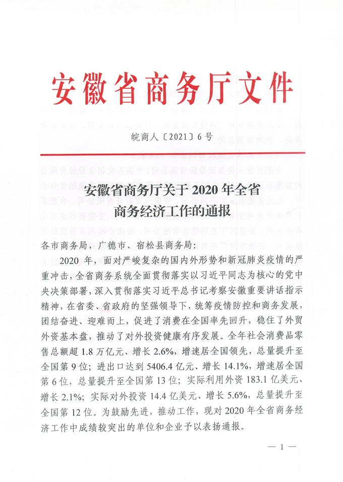 全省商務(wù)工作電視電話會(huì)議2021年1月21日上午在合肥召開。會(huì)上,省商務(wù)廳張箭廳長(zhǎng)對(duì)2020年全省商務(wù)經(jīng)濟(jì)工作中成績(jī)較突出的單位和企業(yè)予以表?yè)P(yáng)通報(bào)。