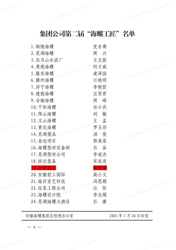 2020年1月26日,海螺集團召開2021年工作會議暨第二屆“海螺工匠”表彰大會,授予24名職工“海螺工匠”的光榮稱號。合肥建工朱紀澤名列其中,成為安糧集團系統(tǒng)內(nèi)首位獲此殊榮的員工。