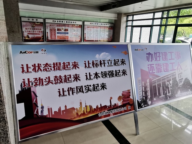 (一樓大廳立標語,建工人擼起袖子加油干)